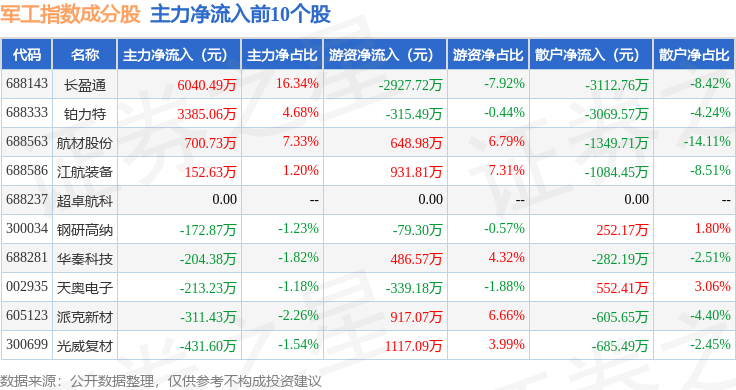 资金流向方面,军工指数(399959)成份股当日主力资金净流出合计17.48亿元,游资资金净流入合计7.84亿元,散户资金净流入合计9.63亿元。成份股资金流向详情见下表: