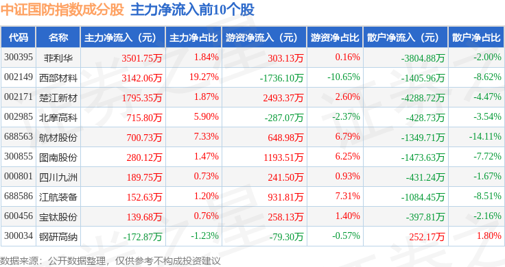 资金流向方面,中证国防(399973)指数成份股当日主力资金净流出合计17.78亿元,游资资金净流入合计7.33亿元,散户资金净流入合计10.44亿元。成份股资金流向详情见下表: