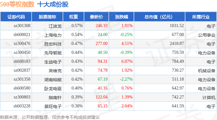 500等权(399982)指数十大成份股详情如下: