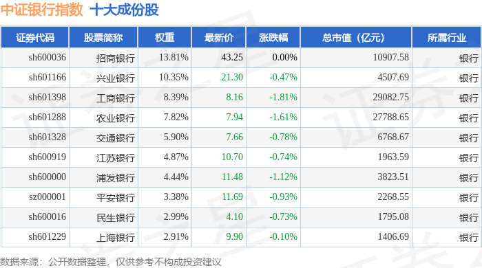 证券之星消息,11月26日,中证银行(399986)指数报收于7767.15点,跌0.77%,成交274.35亿元,换手率0.28%。当日该指数成份股中,上涨的有8家,江阴银行以1.05%的涨幅领涨,下跌的有29家,工商银行以1.81%的跌幅领跌。