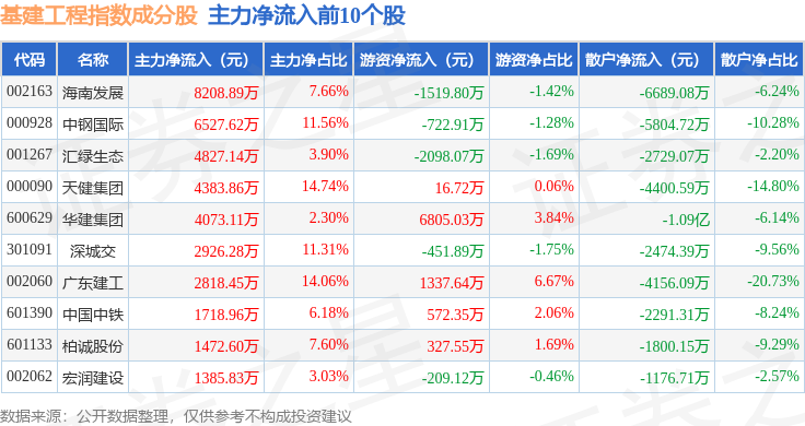 资金流向方面,基建工程(399995)指数成份股当日主力资金净流入合计3081.26万元,游资资金净流入合计2.03亿元,散户资金净流出合计2.34亿元。成份股资金流向详情见下表: