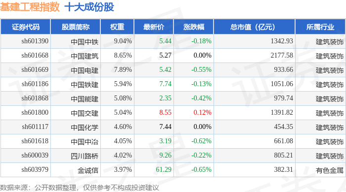 证券之星消息,11月26日,基建工程(399995)指数报收于3822.76点,跌0.2%,成交145.54亿元,换手率0.79%。当日该指数成份股中,上涨的有16家,中钢国际以2.31%的涨幅领涨,下跌的有30家,中国核建以2.8%的跌幅领跌。