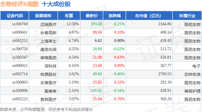资金流向方面,生物经济R(470038)指数成份股当日主力资金净流出合计3.81亿元,游资资金净流入合计1.08亿元,散户资金净流入合计2.73亿元。成份股资金流向详情见下表:
