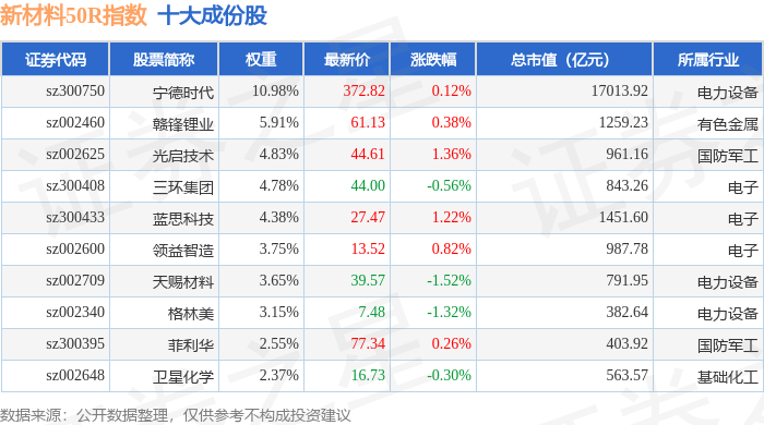 证券之星消息,11月26日,新材料50R(470042)指数报收于3933.63点,跌0.61%,成交571.73亿元,换手率2.23%。当日该指数成份股中,上涨的有14家,中材科技以1.75%的涨幅领涨,下跌的有35家,三角防务以4.76%的跌幅领跌。