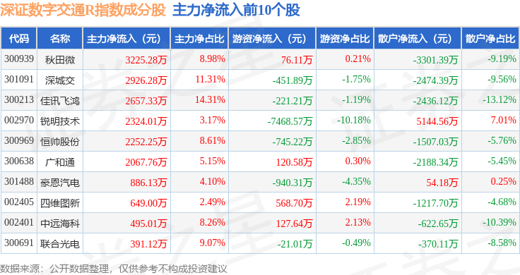 资金流向方面,深证数字交通R(470049)指数成份股当日主力资金净流出合计9.48亿元,游资资金净流入合计2.45亿元,散户资金净流入合计7.03亿元。成份股资金流向详情见下表: