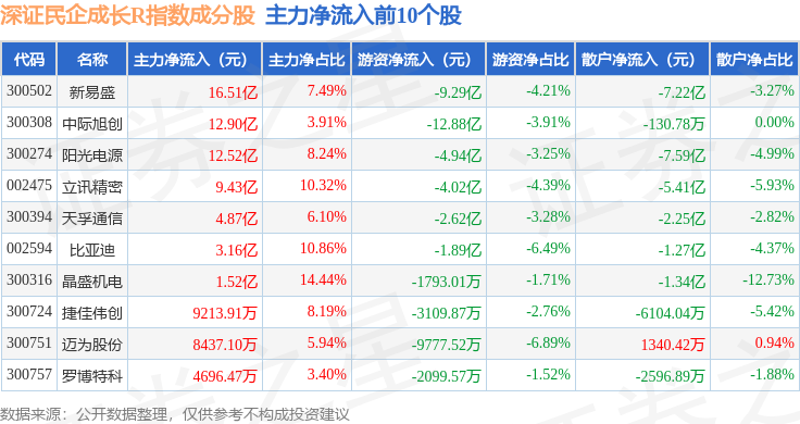 资金流向方面,深证民企成长R(470071)指数成份股当日主力资金净流入合计46.35亿元,游资资金净流出合计34.12亿元,散户资金净流出合计12.23亿元。成份股资金流向详情见下表: