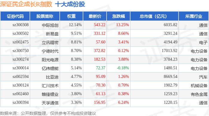证券之星消息,11月26日,深证民企成长R(470071)指数报收于4193.87点,涨3.56%,成交1299.5亿元,换手率2.41%。当日该指数成份股中,上涨的有29家,中际旭创以13.25%的涨幅领涨,下跌的有21家,上能电气以5.36%的跌幅领跌。