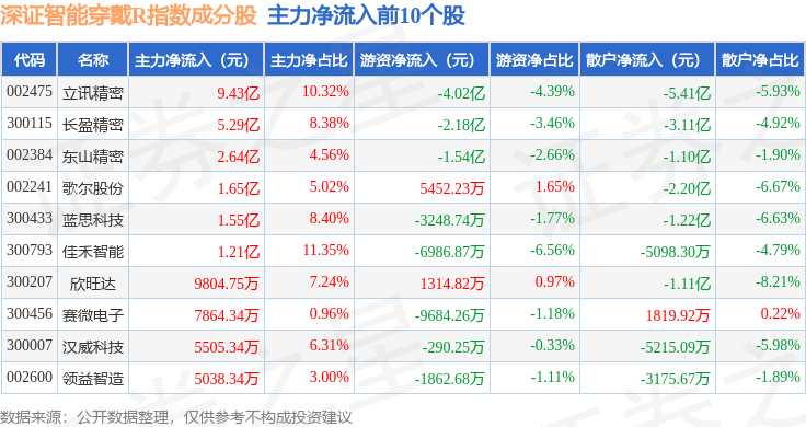 资金流向方面,深证智能穿戴R(470074)指数成份股当日主力资金净流入合计20.33亿元,游资资金净流出合计7.73亿元,散户资金净流出合计12.59亿元。成份股资金流向详情见下表: