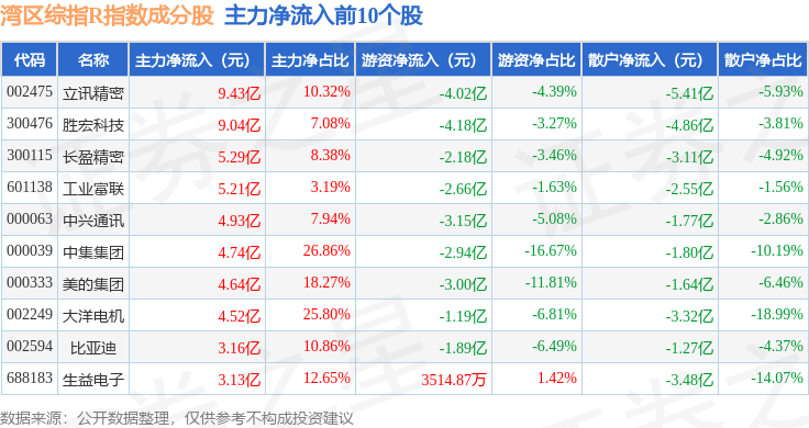 资金流向方面,湾区综指R(480003)指数成份股当日主力资金净流入合计30.83亿元,游资资金净流出合计16.53亿元,散户资金净流出合计14.41亿元。成份股资金流向详情见下表: