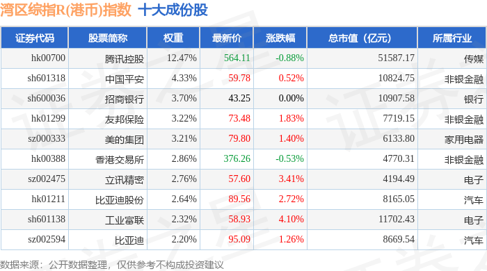 湾区综指R(港币)(480004)指数十大成份股详情如下: