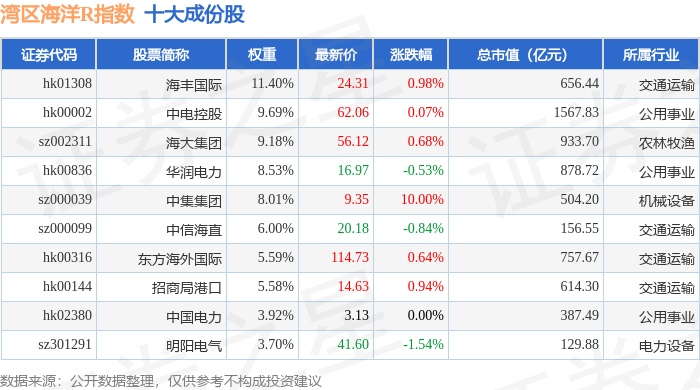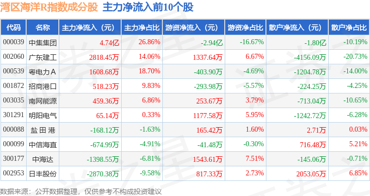 资金流向方面,湾区海洋R(480019)指数成份股当日主力资金净流入合计2.96亿元,游资资金净流出合计2.82亿元,散户资金净流出合计1420.83万元。成份股资金流向详情见下表: