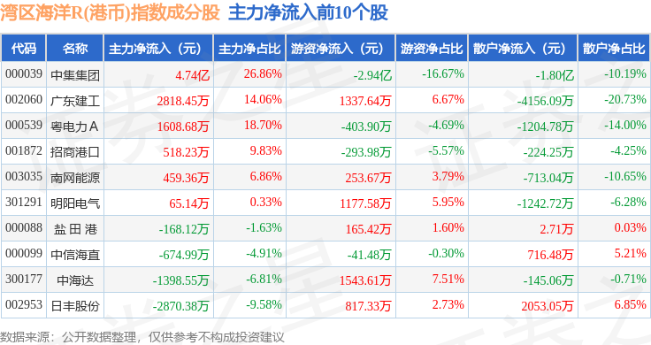 资金流向方面,湾区海洋R(港币)(480020)指数成份股当日主力资金净流入合计2.96亿元,游资资金净流出合计2.82亿元,散户资金净流出合计1420.83万元。成份股资金流向详情见下表: