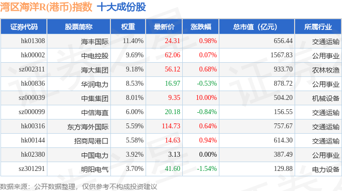 湾区海洋R(港币)(480020)指数十大成份股详情如下: