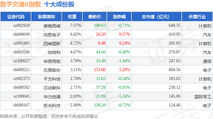 证券之星消息,11月26日,数字交通R(480075)指数报收于3208.53点,跌1.01%,成交241.61亿元,换手率2.09%。当日该指数成份股中,上涨的有13家,芯原股份以5.29%的涨幅领涨,下跌的有37家,晨曦航空以11.35%的跌幅领跌。