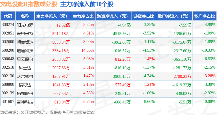 资金流向方面,充电设施R(480077)指数成份股当日主力资金净流入合计9.79亿元,游资资金净流出合计5.26亿元,散户资金净流出合计4.56亿元。成份股资金流向详情见下表: