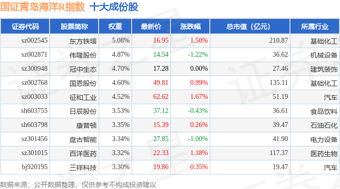 国证青岛海洋R(480532)指数十大成份股详情如下: