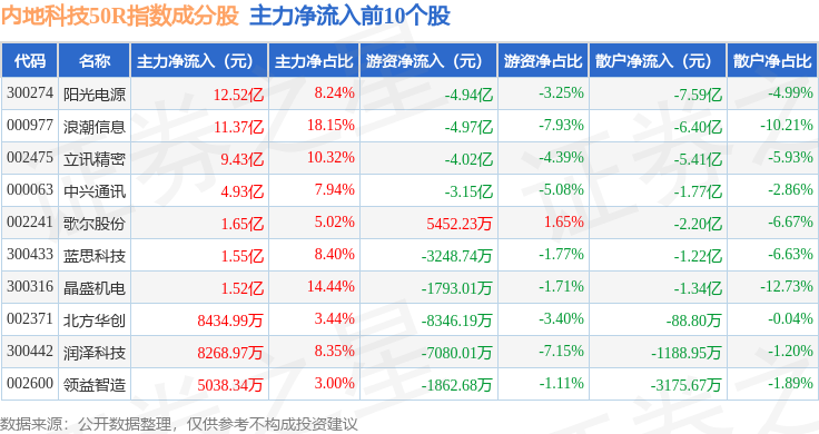 资金流向方面,内地科技50R(483003)指数成份股当日主力资金净流入合计39.94亿元,游资资金净流出合计19.82亿元,散户资金净流出合计20.12亿元。成份股资金流向详情见下表: