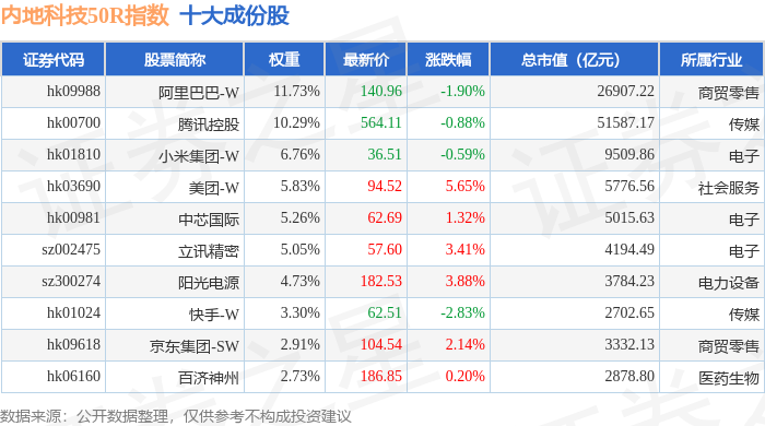 内地科技50R(483003)指数十大成份股详情如下: