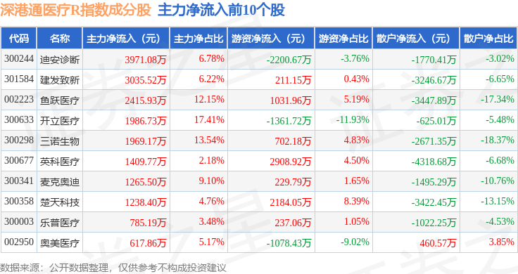 资金流向方面,深港通医疗R(483035)指数成份股当日主力资金净流出合计1.42亿元,游资资金净流入合计9356.92万元,散户资金净流入合计4890.11万元。成份股资金流向详情见下表: