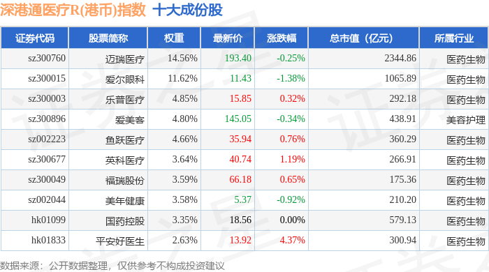 深港通医疗R(港币)(483036)指数十大成份股详情如下: