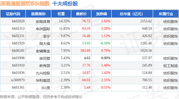 深港通服装纺织R(483041)指数十大成份股详情如下: