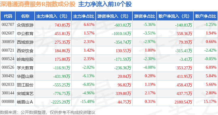 资金流向方面,深港通消费服务R(483045)指数成份股当日主力资金净流出合计4.88亿元,游资资金净流入合计6608.91万元,散户资金净流入合计4.22亿元。成份股资金流向详情见下表: