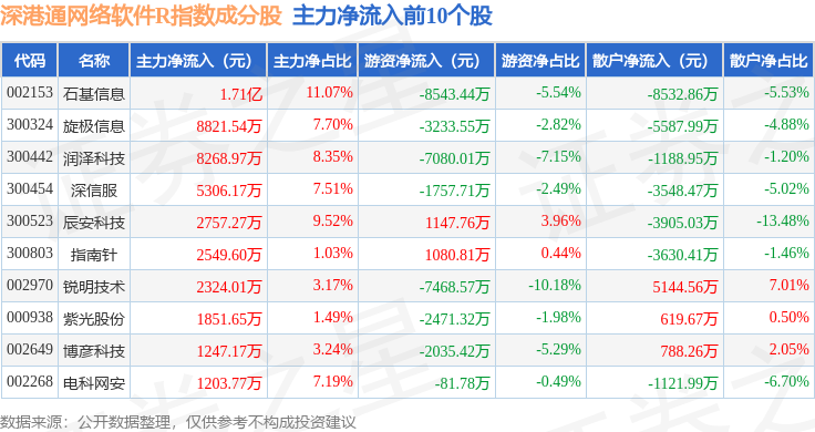 资金流向方面,深港通网络软件R(483047)指数成份股当日主力资金净流出合计49.97亿元,游资资金净流入合计5.97亿元,散户资金净流入合计43.99亿元。成份股资金流向详情见下表: