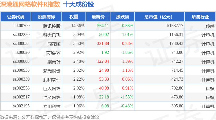 深港通网络软件R(483047)指数十大成份股详情如下: