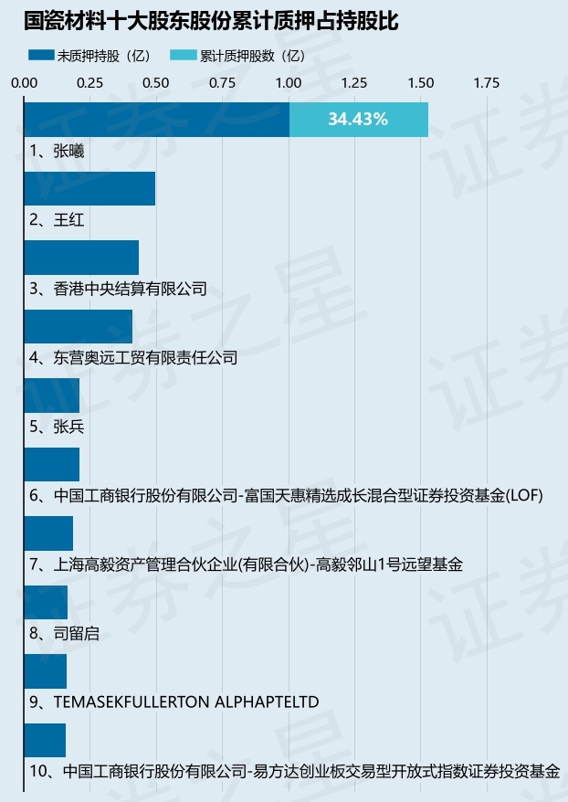 截止本公告日,股东张曦已累计质押股份5267.0万股,占其持股总数的34.43%。本次质押后国瓷材料十大股东的累计质押股份占持股比例(占持股比例的计算以公司最新一期财务报表公布的十大股东的持股总数为基准)见下图: