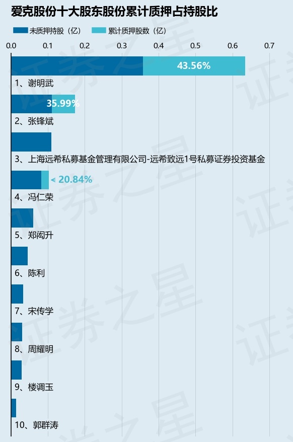 截止本公告日,股东谢明武已累计质押股份2764.7万股,占其持股总数的43.56%,股东张锋斌已累计质押股份623.5万股,占其持股总数的35.99%,股东冯仁荣已累计质押股份215.0万股,占其持股总数的20.84%。本次质押后爱克股份十大股东的累计质押股份占持股比例(占持股比例的计算以公司最新一期财务报表公布的十大股东的持股总数为基准)见下图: