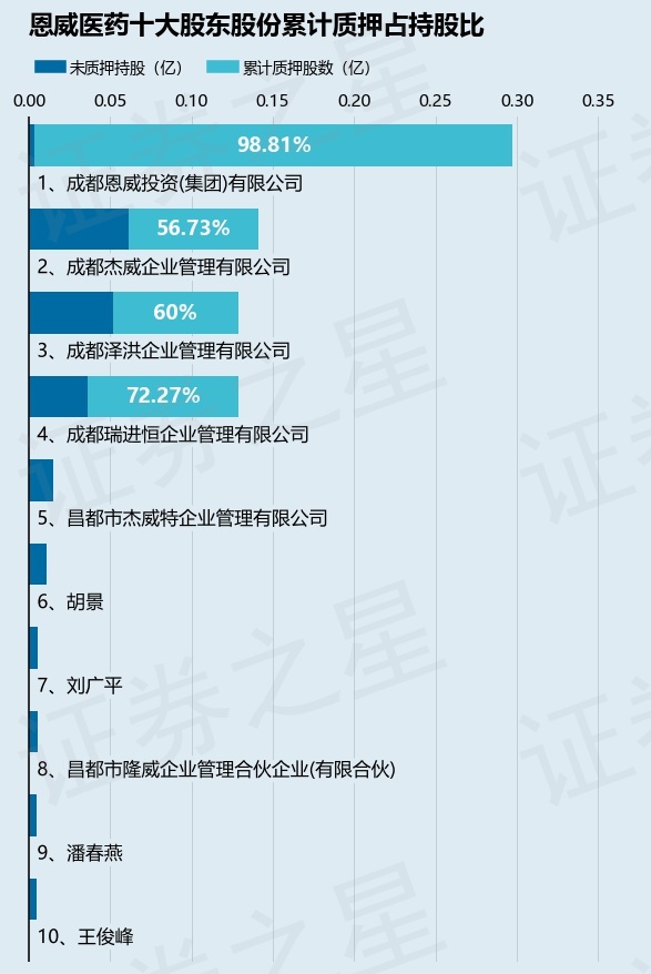 截止本公告日,股东成都恩威投资(集团)有限公司已累计质押股份2938.0万股,占其持股总数的98.81%,股东成都杰威企业管理有限公司已累计质押股份800.0万股,占其持股总数的56.73%,股东成都泽洪企业管理有限公司已累计质押股份773.0万股,占其持股总数的60.0%,股东成都瑞进恒企业管理有限公司已累计质押股份931.08万股,占其持股总数的72.27%。本次质押后恩威医药十大股东的累计质押股份占持股比例(占持股比例的计算以公司最新一期财务报表公布的十大股东的持股总数为基准)见下图:
