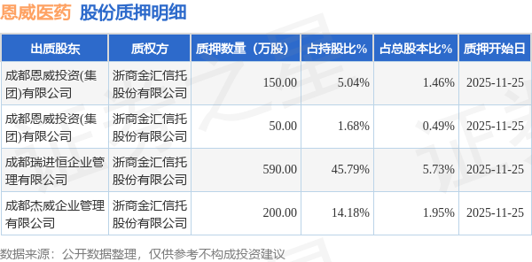 证券之星消息,恩威医药(301331)11月26日公开信息显示,股东成都恩威投资(集团)有限公司、成都瑞进恒企业管理有限公司、成都杰威企业管理有限公司向浙商金汇信托股份有限公司合计质押990.0万股,占总股本9.63%。质押详情见下表: