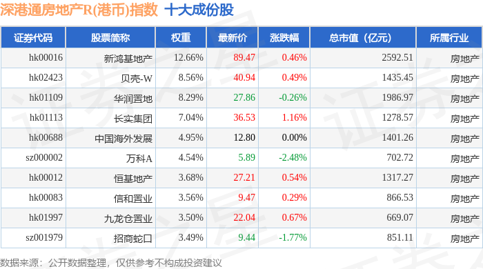 深港通房地产R(港币)(483072)指数十大成份股详情如下: