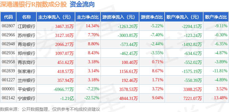 资金流向方面,深港通银行R(483081)指数成份股当日主力资金净流出合计8046.25万元,游资资金净流入合计4569.37万元,散户资金净流入合计3476.88万元。成份股资金流向详情见下表:
