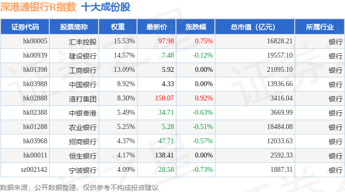 证券之星消息,11月26日,深港通银行R(483081)指数报收于12545.18点,跌0.23%,成交80.19亿元,换手率0.16%。当日该指数成份股中,上涨的有12家,中国光大银行以1.34%的涨幅领涨,下跌的有12家,青岛银行以1.74%的跌幅领跌。