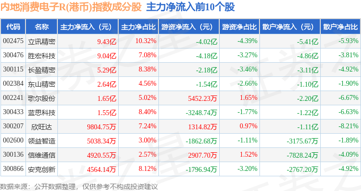 资金流向方面,内地消费电子R(港币)(483106)指数成份股当日主力资金净流入合计27.18亿元,游资资金净流出合计9.37亿元,散户资金净流出合计17.81亿元。成份股资金流向详情见下表: