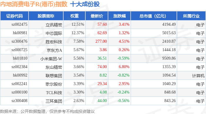 内地消费电子R(港币)(483106)指数十大成份股详情如下: