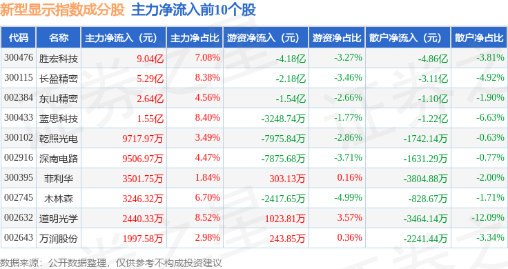 资金流向方面,新型显示(970048)指数成份股当日主力资金净流入合计16.55亿元,游资资金净流出合计9.47亿元,散户资金净流出合计7.08亿元。成份股资金流向详情见下表: