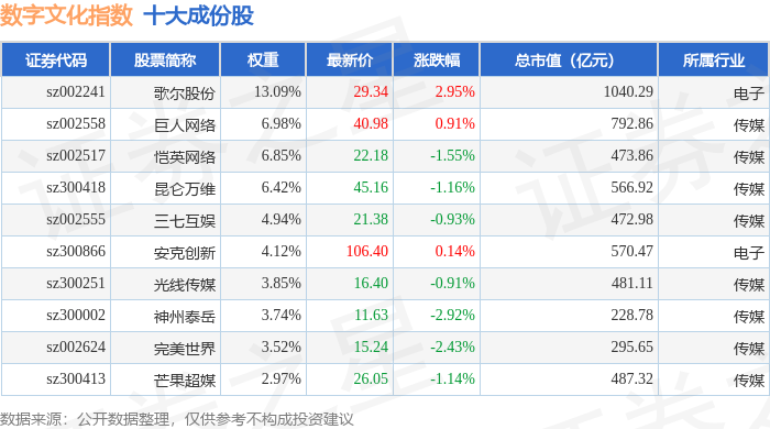 证券之星消息,11月26日,数字文化(970047)指数报收于1099.76点,跌0.53%,成交350.15亿元,换手率4.45%。当日该指数成份股中,上涨的有12家,奋达科技以9.99%的涨幅领涨,下跌的有38家,富春股份以11.11%的跌幅领跌。