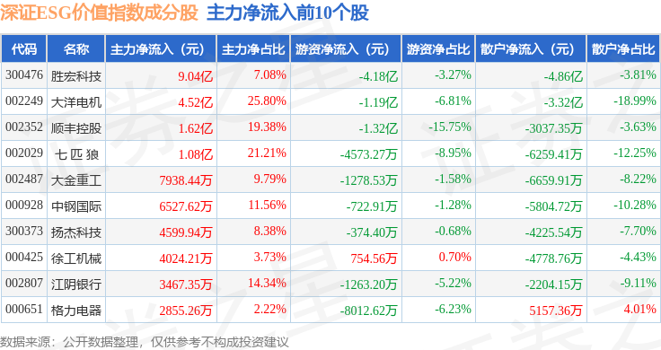 资金流向方面,深证ESG价值(970061)指数成份股当日主力资金净流入合计16.92亿元,游资资金净流出合计7.87亿元,散户资金净流出合计9.05亿元。成份股资金流向详情见下表: