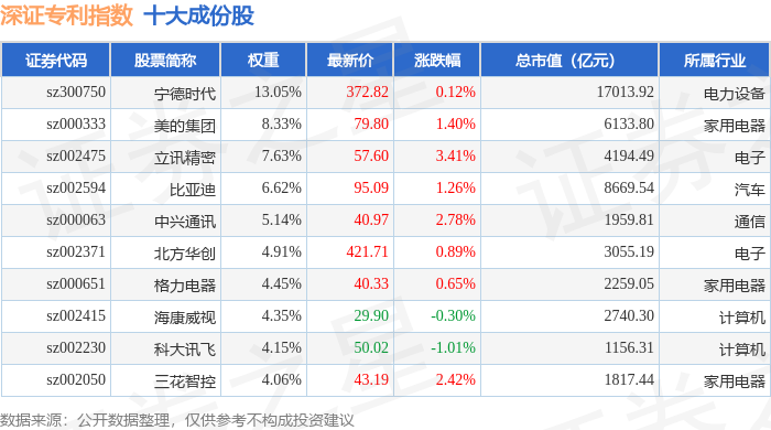 深证专利(970067)指数十大成份股详情如下: