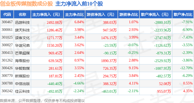 资金流向方面,创业板传媒(970084)指数成份股当日主力资金净流出合计31.39亿元,游资资金净流入合计5.01亿元,散户资金净流入合计26.38亿元。成份股资金流向详情见下表: