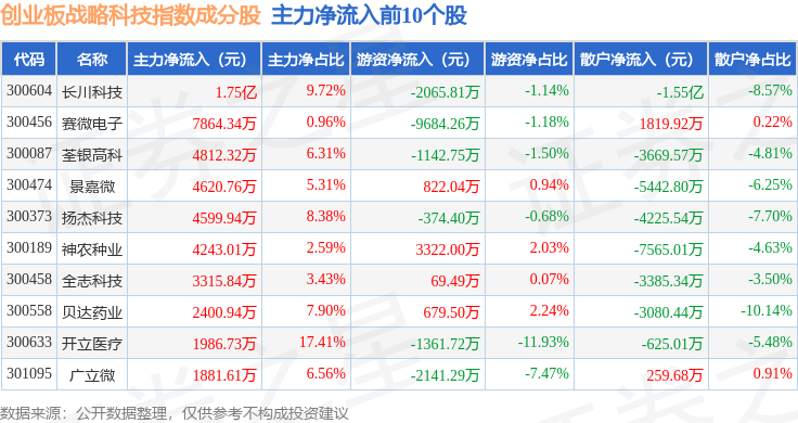 资金流向方面,创业板战略科技(971004)指数成份股当日主力资金净流出合计6.59亿元,游资资金净流入合计1.4亿元,散户资金净流入合计5.19亿元。成份股资金流向详情见下表: