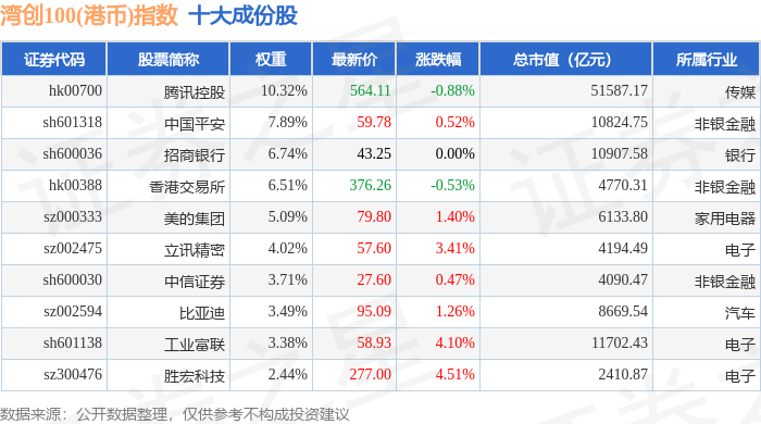 湾创100(港币)(980002)指数十大成份股详情如下: