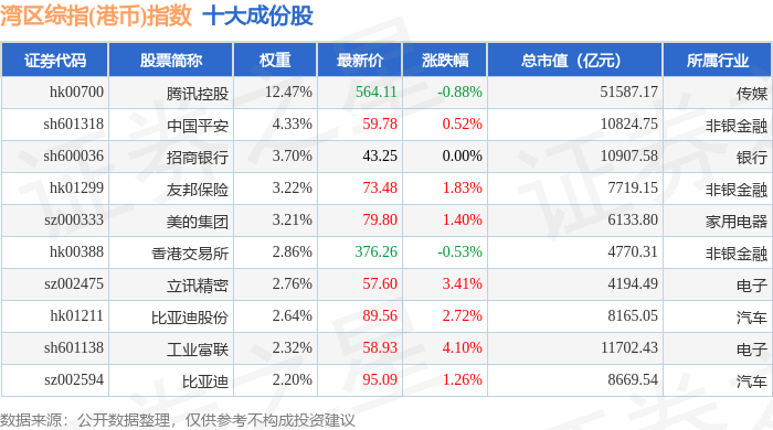湾区综指(港币)(980004)指数十大成份股详情如下: