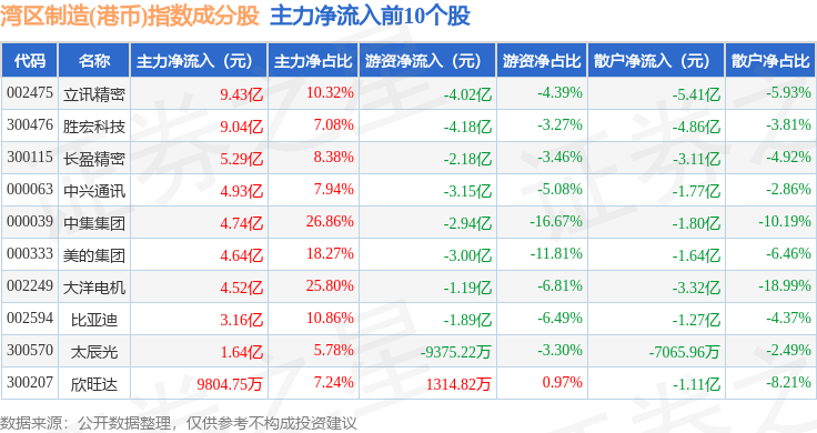 资金流向方面,湾区制造(港币)(980010)指数成份股当日主力资金净流入合计33.44亿元,游资资金净流出合计19.73亿元,散户资金净流出合计13.71亿元。成份股资金流向详情见下表:
