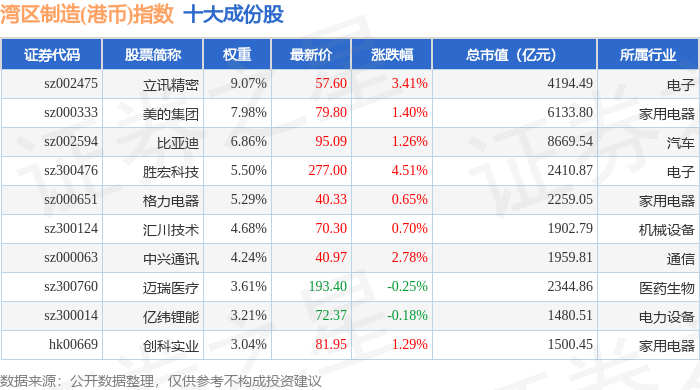 湾区制造(港币)(980010)指数十大成份股详情如下: