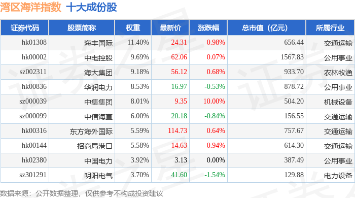 证券之星消息,11月26日,湾区海洋(980019)指数报收于1650.75点,涨0.15%,成交67.36亿元,换手率0.93%。当日该指数成份股中,上涨的有9家,中集集团以10.0%的涨幅领涨,下跌的有11家,江龙船艇以12.43%的跌幅领跌。