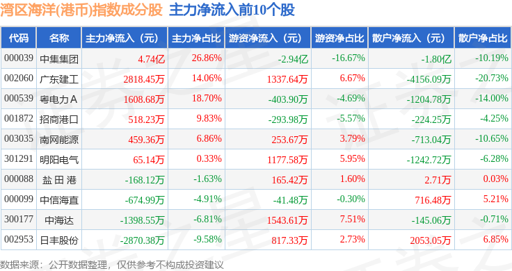 资金流向方面,湾区海洋(港币)(980020)指数成份股当日主力资金净流入合计2.96亿元,游资资金净流出合计2.82亿元,散户资金净流出合计1420.83万元。成份股资金流向详情见下表: