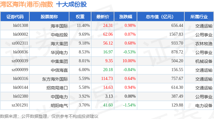 湾区海洋(港币)(980020)指数十大成份股详情如下: